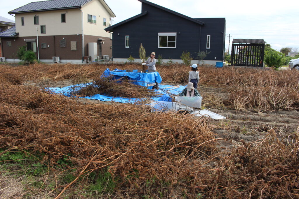 10月22日、脱穀作業。それぞれに作業を分担して、手作業でエゴマの脱穀作業。手作業は時間と労力がかかりあすが、家族で楽しみながら行いました。